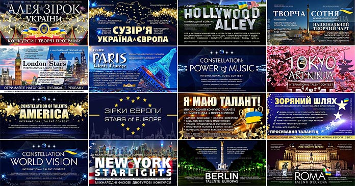 Конкурси Україна, Україна-Європа, Україна-США – всеукраїнські та міжнародні – проводять творча екосистема Алея Зірок України і міжнародна мережа талантів Constellation World Talent Network.