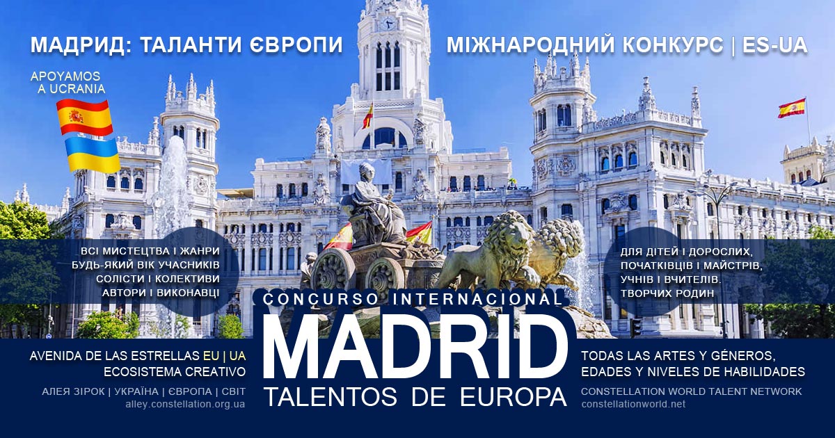 Міжнародний конкурс MADRID: TALENTOS DE EUROPA | МАДРИД: ТАЛАНТИ ЄВРОПИ, 2-й сезон, запрошує всіх творчих людей – авторів і виконавців, солістів і колективи будь-якого віку, педагогів. Є всі мистецтва і жанри, а також педагогічна майстерність. Зручна дистанційна участь.
